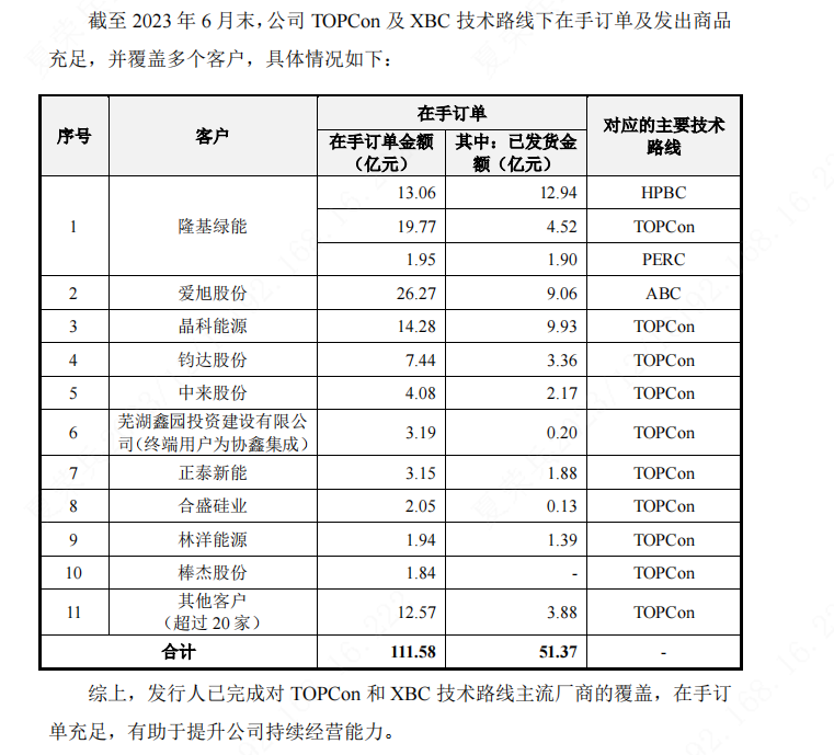 拉普拉斯的光伏电池片工艺设备已进入包括隆基绿能、晶科能源、爱旭股份、钧达股份、中来股份、横店东磁、正泰新能等众多光伏行业内领先企业,形成了规模化的交付数量和营业收入。截至2023年6月末,拉普拉斯在手订单销售价值达111.58亿元。