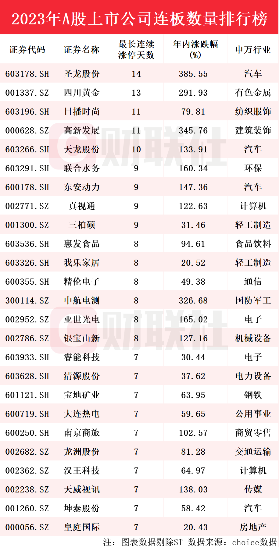 2023年A股连板王年终盘点 圣龙股份14连板连续涨停天数最多 四川黄金13连板紧随其后