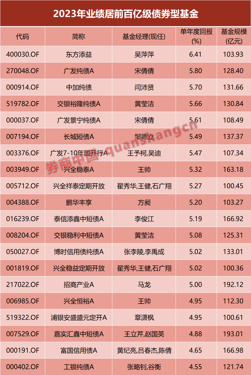 不过上述基金规模不大,超高的业绩表现不具代表性。百亿规模的债券型基金中,东方添益、广发纯债A、中加纯债、交银裕隆纯债A、广发景宁纯债A和长城短债A年内业绩均超5%,侧面反映出今年债券市场的牛市行情。