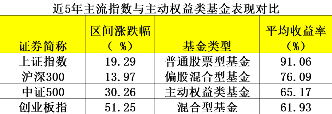 而持股仓位最高的主动股票型基金,近五年的平均收益率达91.06%,偏股混合基金为76.09%,主动权益类基金、混合型基金的同期平均回报也都超过60%。