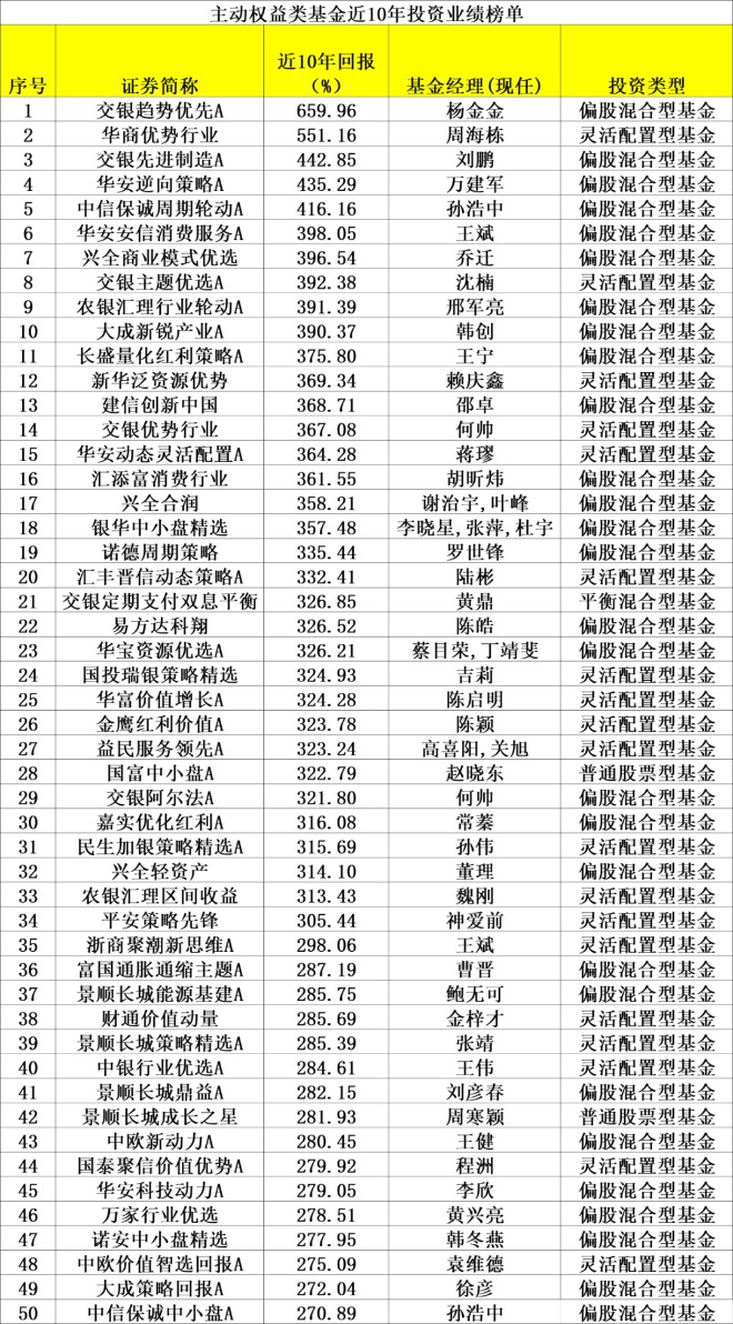 乔迁管理的兴全商业模式优选、韩创管理的大成新锐产业、胡昕炜管理的汇添富消费行业、谢治宇等人管理的兴全合润、李晓星等人管理的银华中小盘精选等在内的多位知名基金经理旗下基金产品,都跻身近十年前50强榜单,展现了较强的长期回报能力。