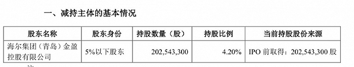 海尔金盈在中国证券登记结算有限责任公司上海分公司登记持有公司202,543,300股A股股份,占公司总股本的4.20%,均为在公司首次公开发行A股股票并上市前取得的股份,相关股份已上市流通。