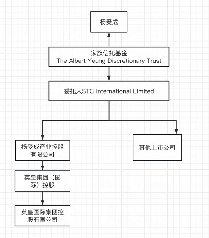 他发起设立全权委托的家族信托基金The Albert Yeung Discretionary Trust,委托人为离岸公司STC International Limited,STC International (Hongkong)Limited通过该家族信托基金,100%控股杨受成产业控股有限公司(下称“杨受成产业控股”)和英皇系其他几家上市公司。