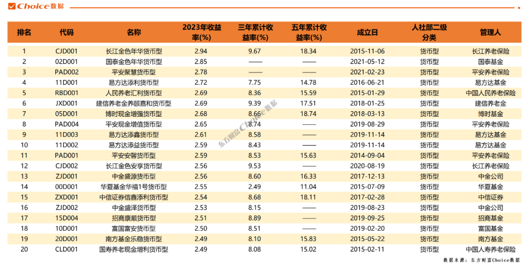 表3:2023年收益排名前20的流动资产类年金养老金产品