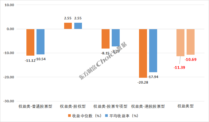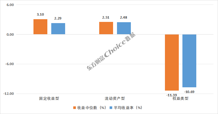 2023年,权益类产品中只有股权型产品整体收益水平为正,平均收益率为2.55%,收益率中位数为2.55%。