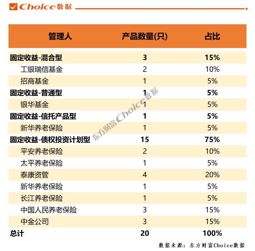 从产品维度来看,2023年收益排名前20的固收类产品管理人中,泰康资管入围产品最多,占20%,均为稳健回报基础设施债权投资计划型系列产品;人民养老保险入围3只产品,占15%,均为汇鑫债权计划型系列产品;中金公司也入围3只产品,占15%,均为安泰分期债权投资计划型系列产品。