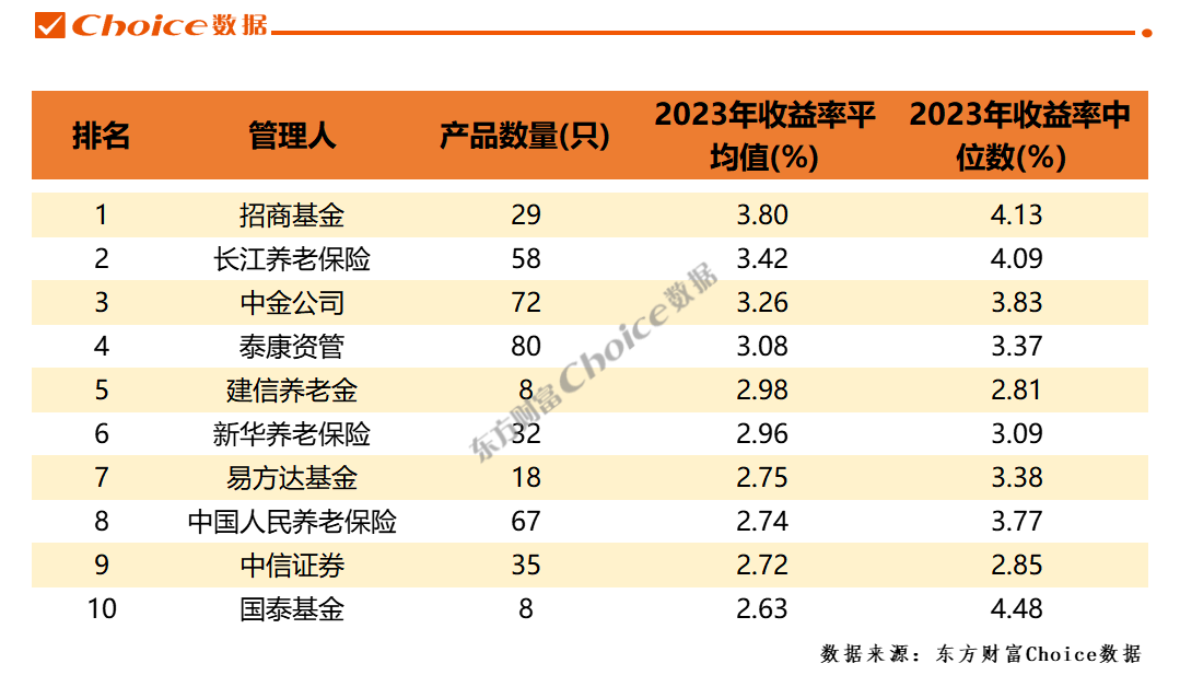 表4:2023年年金养老金产品平均收益率前十的管理人