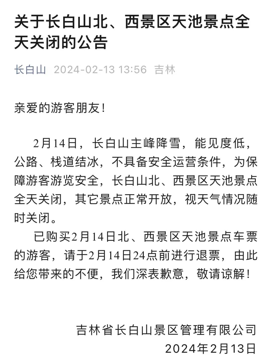 另外,2月13日下午,吉林省长白山景区管理有限公司再发公告称,长白山主峰降雪,能见度低,公路、栈道结冰,不具备安全运营条件,为保障游客游览安全,长白山北、西景区天池景点全天关闭,其它景点正常开放,视天气情况随时关闭。已购买2月14日北、西景区天池景点车票的游客,请于2月14日24点前进行退票。