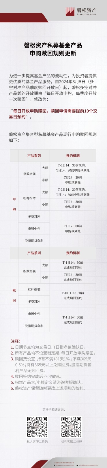 2月21日,磐松资产公告称,为进一步提高基金产品的流动性,为投资者提供更优质的基金产品服务,自2024年3月5日起,磐松多空对冲产品线的开放期由“每日开放申购,每季度开放一次赎回”,修改为“每日开放申购赎回,赎回申请需要提前10个交易日预约”。