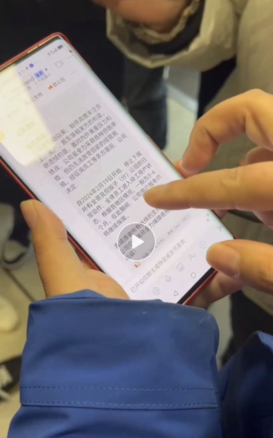 根据现场高合汽车工厂员工向红星资本局展示的短信通知,“自2024年2月19日开始,停止下属所有全资及控股子(分)公司的日常运作,全体员工进入停工停产状态,根据各地区情况,一般为3-6个月。”