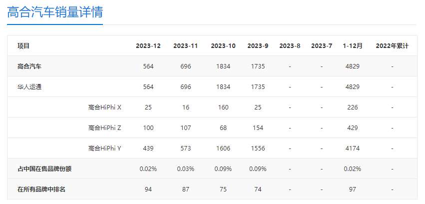 2021年和2022年,高合汽车凭借HiPhi X一款车型,年销量分别为4237辆和4349辆。