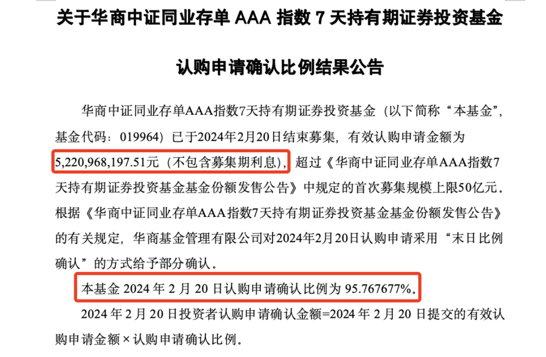 2月22日,华商基金公告,旗下中证同业存单AAA指数基金一日大卖52.21亿元,同时启动比例配售,这也是今年以来第一只一日售罄并触发比例配售的公募基金产品。