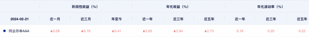 Wind数据显示,截至2月21日,中证同业存单AAA指数今年以来上涨0.41%,最近一年年化收益为2.63%,最近三年年化收益为2.64%。目前全市场共有78只同业存单基金,今年以来平均上涨0.33%,去年年末合计规模超过1600亿元。