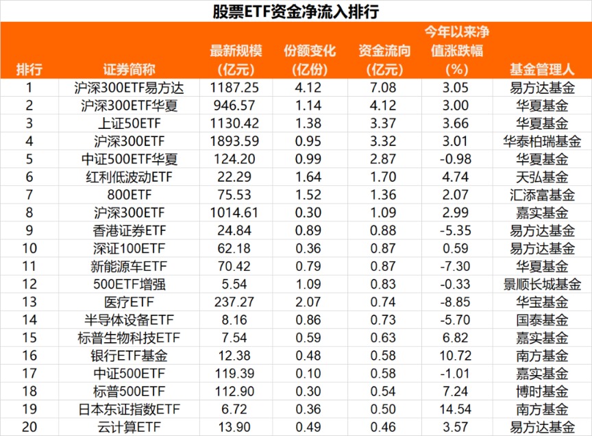 股票ETF资金流向显示,当日行情中,出现约24亿元资金净流出, 沪深300ETF、上证50ETF、中证500ETF领衔“吸金”,中证2000ETF、科创50ETF、创业板ETF、中证1000ETF则成“失血”主阵营。
