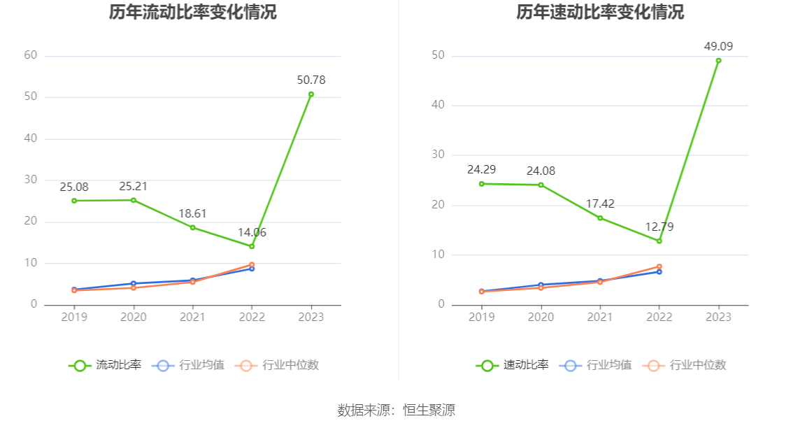 2023年,公司流动比率为50.78,速动比率为49.09。