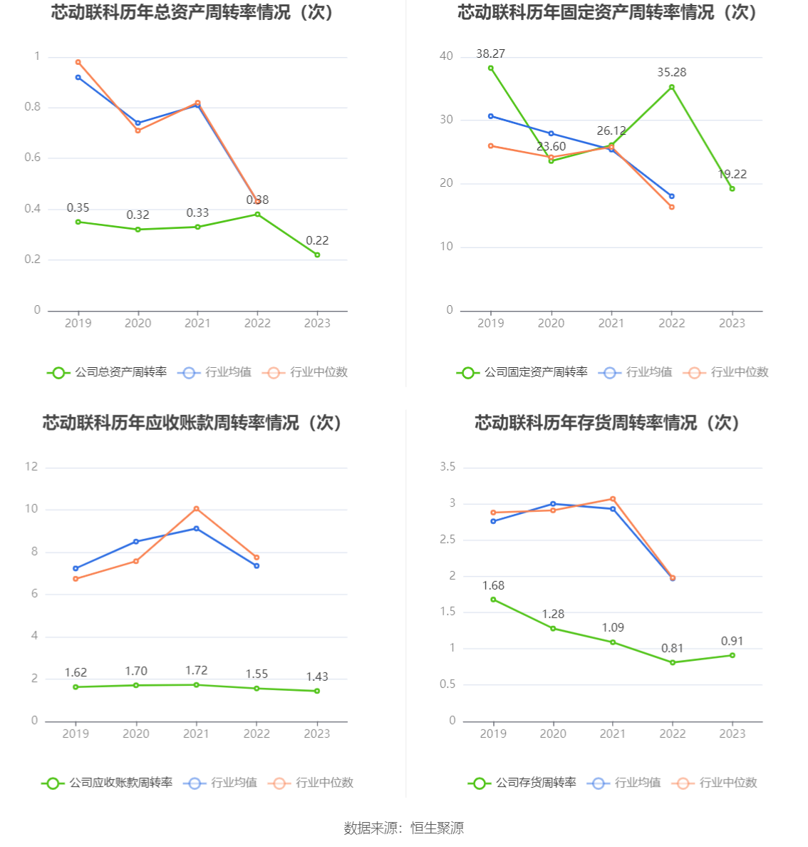 营运能力方面,2023年,公司公司总资产周转率为0.22次,上年同期为0.38次(2022年行业平均值为0.43次,公司位居同行业24/34);固定资产周转率为19.22次,上年同期为35.28次(2022年行业平均值为18.04次,公司位居同行业7/34);公司应收账款周转率、存货周转率分别为1.43次、0.91次。