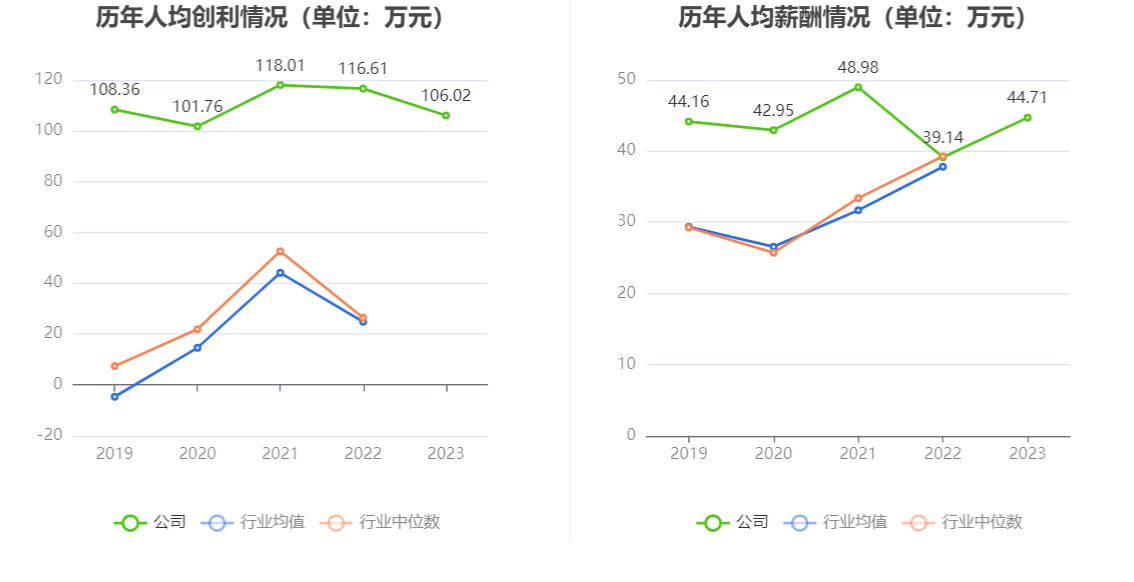 截至2023年末,公司员工总数为156人,人均创收203.26万元,人均创利106.02万元,人均薪酬44.71万元,较上年同期分别变化-10.40%、-9.07%、14.21%。