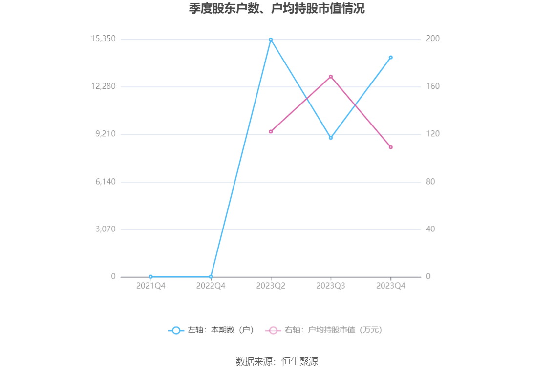 筹码集中度方面,截至2023年年末,公司股东总户数为1.42万户,较三季度末增长了5183户,增幅57.69%;户均持股市值由三季度末的168.48万元下降至109.19万元,降幅为35.19%。