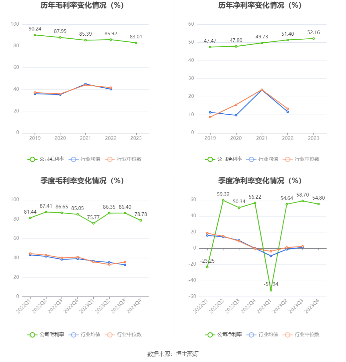 2023年,公司毛利率为83.01%,同比下降2.91个百分点;净利率为52.16%,较上年同期上升0.76个百分点。从单季度指标来看,2023年第四季度公司毛利率为78.78%,同比下降6.27个百分点,环比下降7.62个百分点;净利率为54.80%,较上年同期下降1.42个百分点,较上一季度下降3.90个百分点。