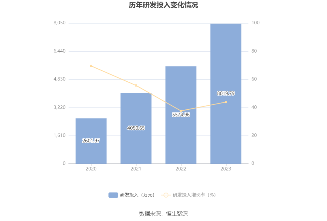 2023年全年,公司研发投入金额为8019.79万元,同比增长43.85%;研发投入占营业收入比例为25.29%,相比上年同期上升0.72个百分点。