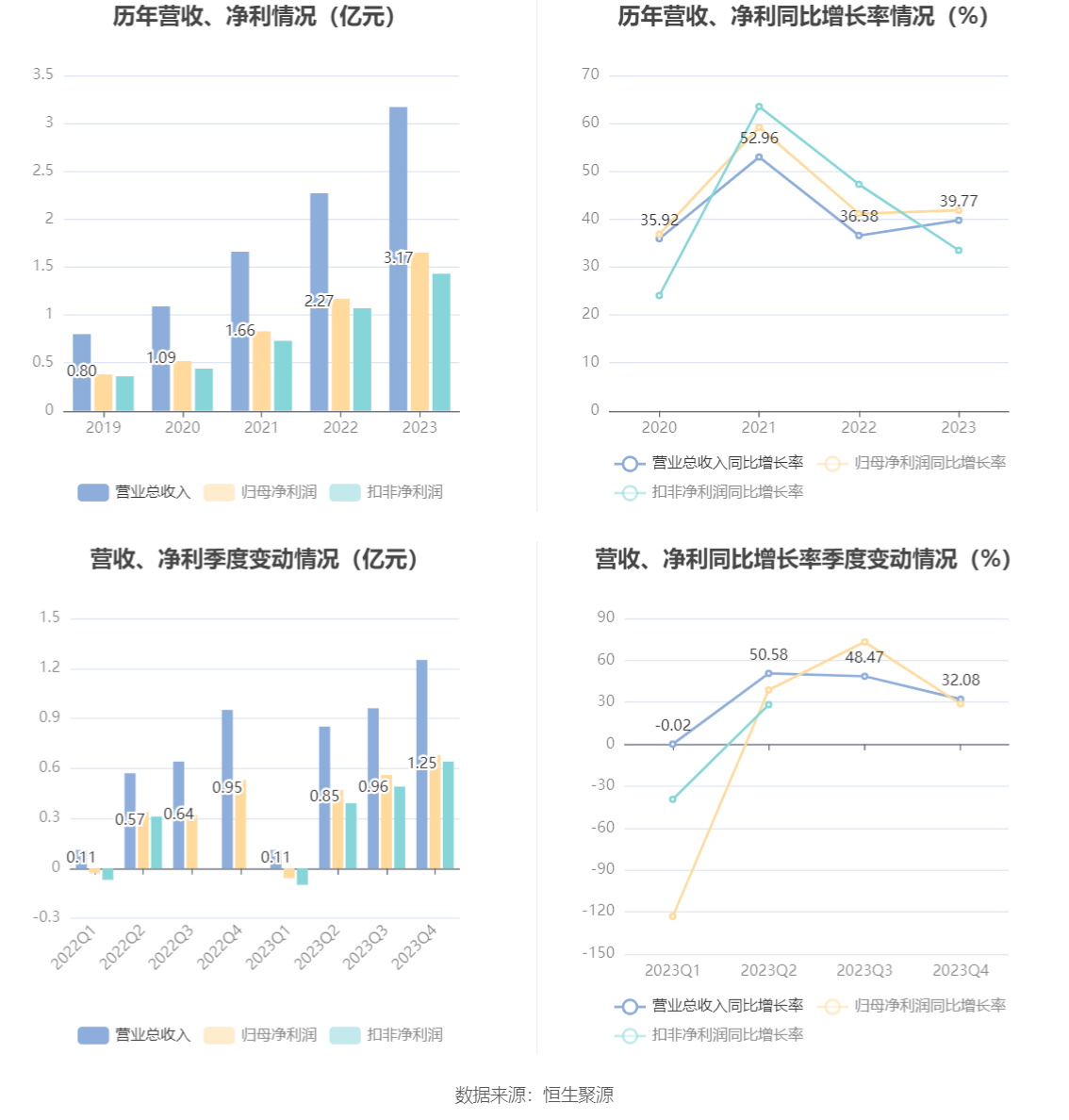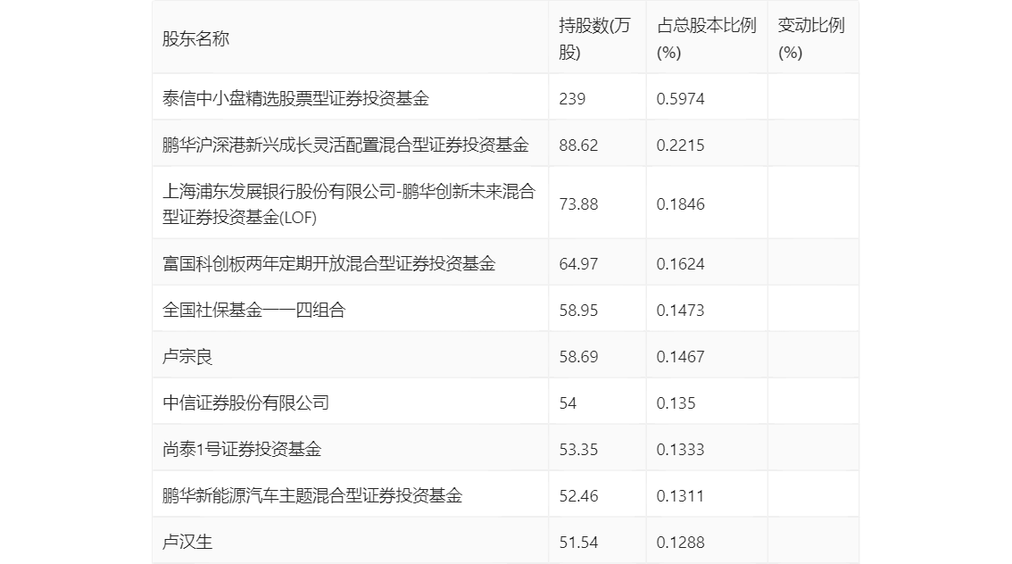 年报显示,2023年年末公司十大流通股东中,新进股东为鹏华沪深港新兴成长灵活配置混合型证券投资基金、全国社保基金一一四组合、中信证券股份有限公司、鹏华新能源汽车主题混合型证券投资基金,取代了三季度末的朱顺美、兴全多维价值混合型证券投资基金、丁建荣、信澳先进智造股票型证券投资基金。在具体持股比例上,泰信中小盘精选股票型证券投资基金、上海浦东发展银行股份有限公司-鹏华创新未来混合型证券投资基金(LOF)、卢宗良、卢汉生持股有所上升,尚泰1号证券投资基金持股有所下降。