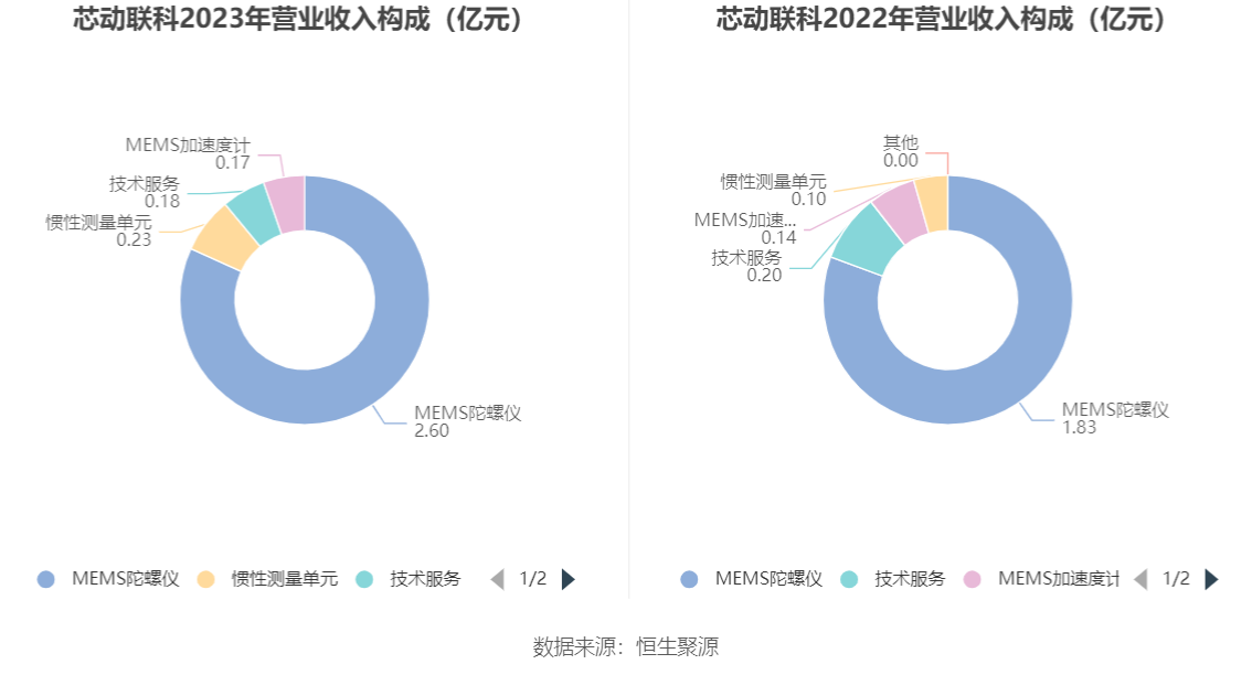 分产品来看,2023年公司主营业务中,MEMS陀螺仪收入2.60亿元,同比增长42.37%,占营业收入的82.13%;惯性测量单元收入0.23亿元,同比增长128.59%,占营业收入的7.12%;技术服务收入0.18亿元,同比下降12.91%,占营业收入的5.55%。