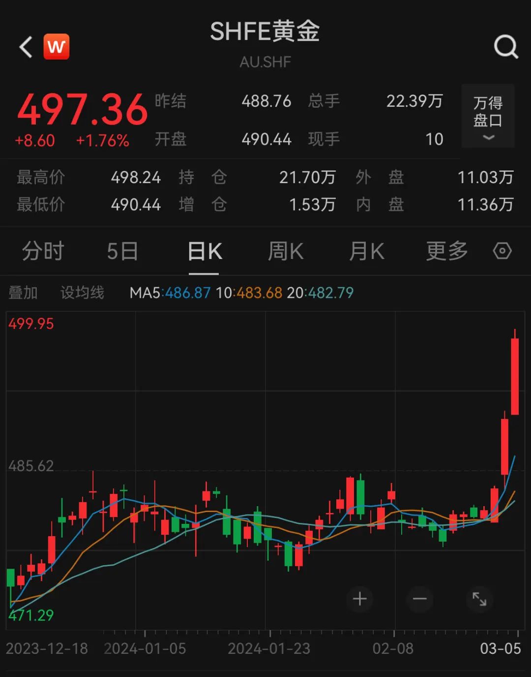 而在黄金期货方面,沪金主力期货进入三月以来,连续四日上涨。截至3月5日收盘,沪金上涨1.76%,报收497.36元/克,同样创下历史新高。