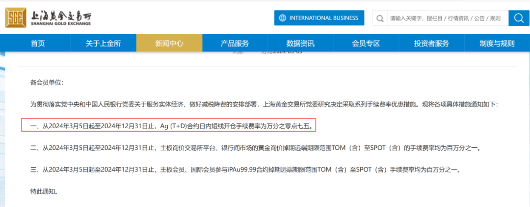 一、从2024年3月5日起至2024年12月31日止,Ag (T+D)合约日内短线开仓手续费率为万分之零点七五。