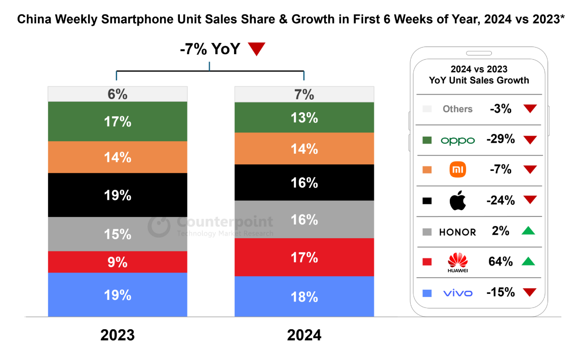 5日,消息称,市场调研机构Counterpoint Research数据显示,今年前六周,苹果公司在中国的iPhone销量同比下降24%。从市场份额来看,苹果在中国智能手机市场的份额降至15.7%,位居第四,而在2023年同期,苹果的市场份额为19%,位居第二。