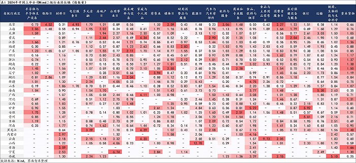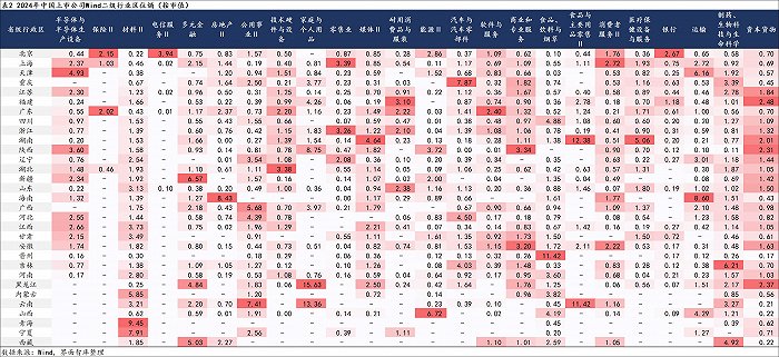 北京和湖南均拥有三个“市值区位熵”排名第一的行业,北京包括电信服务II(3.94),银行(2.67),保险II(2.15),中国三大电信运营商等大型央企对相关行业“规模集聚度”的贡献较为显著,以及由于多数的头部上市银行、保险公司大多集中在北京,导致银行和保险业的“规模集聚度”也较为突出;湖南除了食品与主要用品零售II行业外,还包括医疗保健设备与服务(5.06),媒体II(4.64)。