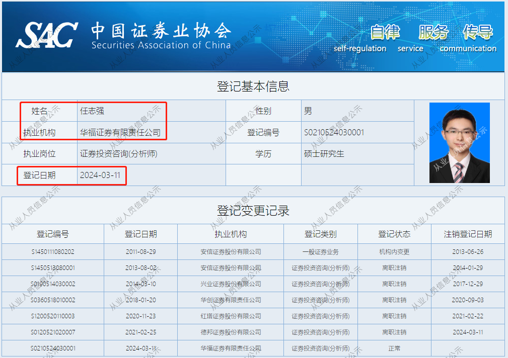 中国证券业协会信息也显示,任志强最新的执业机构已经变更为华福证券,登记日期为2024年3月11日。