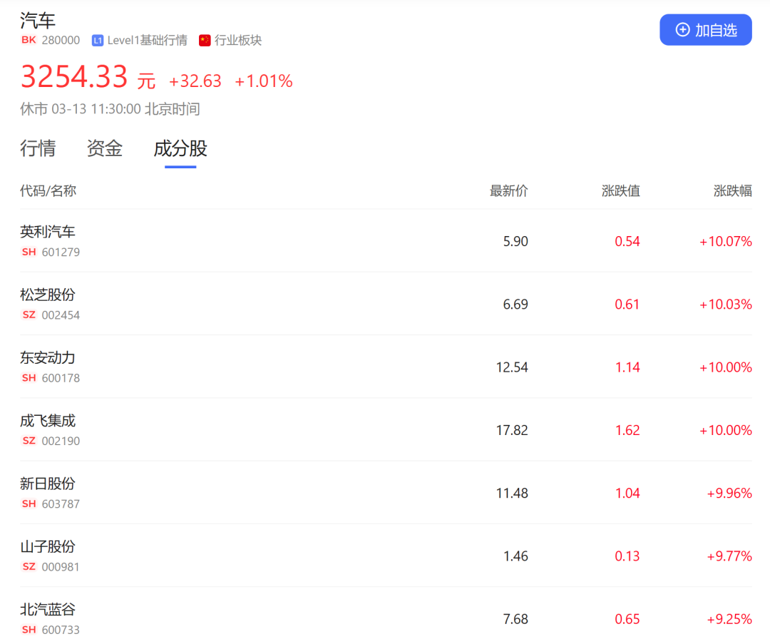 汽车股强者恒强,板块指数放量高开高走,盘中涨近2%,创年内新高。松芝股份开盘一字涨停;英利汽车连续第2日封板;北汽蓝谷3日2涨停,自2月低点以来,累计大涨超100%;东安动力等亦强势涨停。