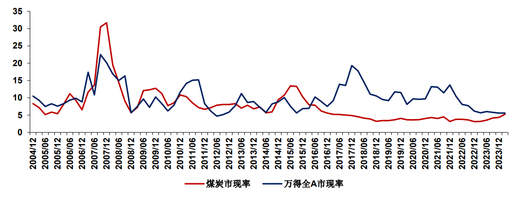图6:煤炭和万得全A市现率及市现率中位数情况