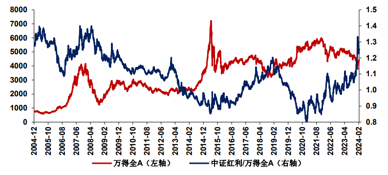 图表2:万得全A和中证红利走势