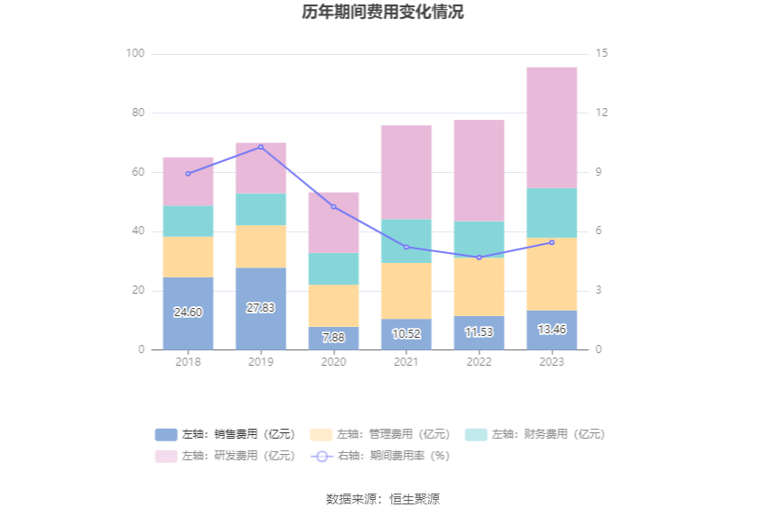 2023年,公司期间费用为95.54亿元,较上年同期增加17.80亿元;期间费用率为5.45%,较上年同期上升0.75个百分点。其中,销售费用同比增长16.78%,管理费用同比增长24.61%,研发费用同比增长19.32%,财务费用同比增长35.75%。