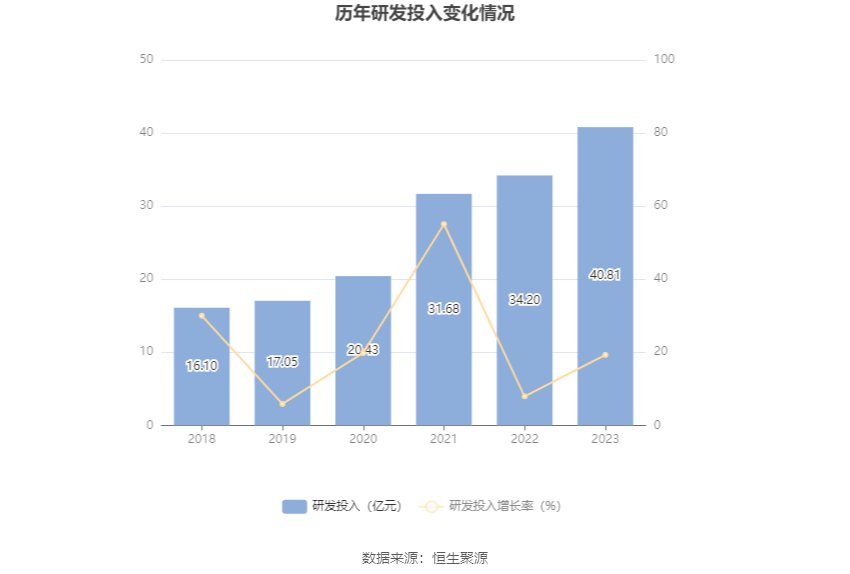 2023年全年,公司研发投入金额为40.81亿元,同比增长19.32%;研发投入占营业收入比例为2.33%,相比上年同期上升0.26个百分点。此外,公司全年研发投入资本化率为0。