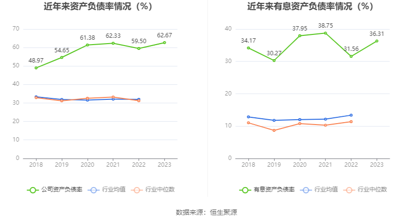 在偿债能力方面,公司2023年年末资产负债率为62.67%,相比上年末上升3.17个百分点;有息资产负债率为36.31%,相比上年末上升4.75个百分点。