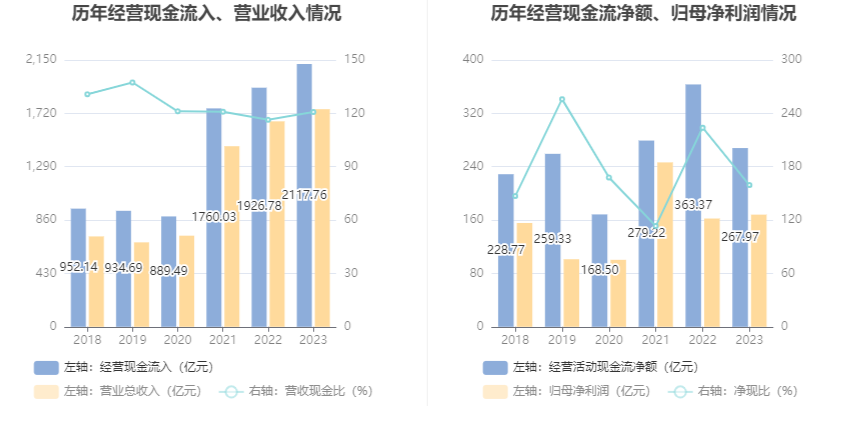 2023年,公司经营活动现金流净额为267.97亿元,同比下降26.25%;筹资活动现金流净额228.09亿元,同比增加399.97亿元;投资活动现金流净额-448.30亿元,上年同期为-343.25亿元。