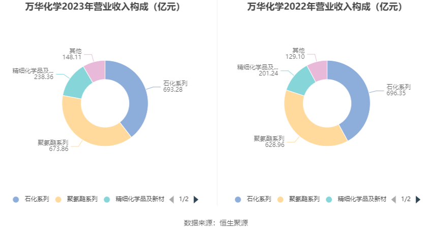 分产品来看,2023年公司主营业务中,石化系列收入693.28亿元,同比下降0.44%,占营业收入的39.53%;聚氨酯系列收入673.86亿元,同比增长7.14%,占营业收入的38.43%;精细化学品及新材料系列收入238.36亿元,同比增长18.45%,占营业收入的13.59%。