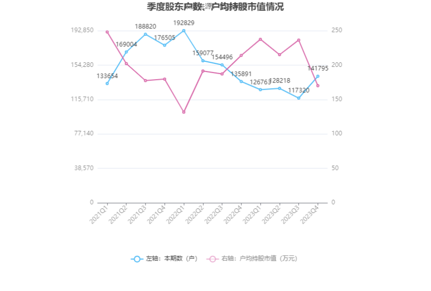 筹码集中度方面,截至2023年年末,公司股东总户数为14.18万户,较三季度末增长了2.45万户,增幅20.86%;户均持股市值由三季度末的236.36万元下降至170.10万元,降幅为28.03%。