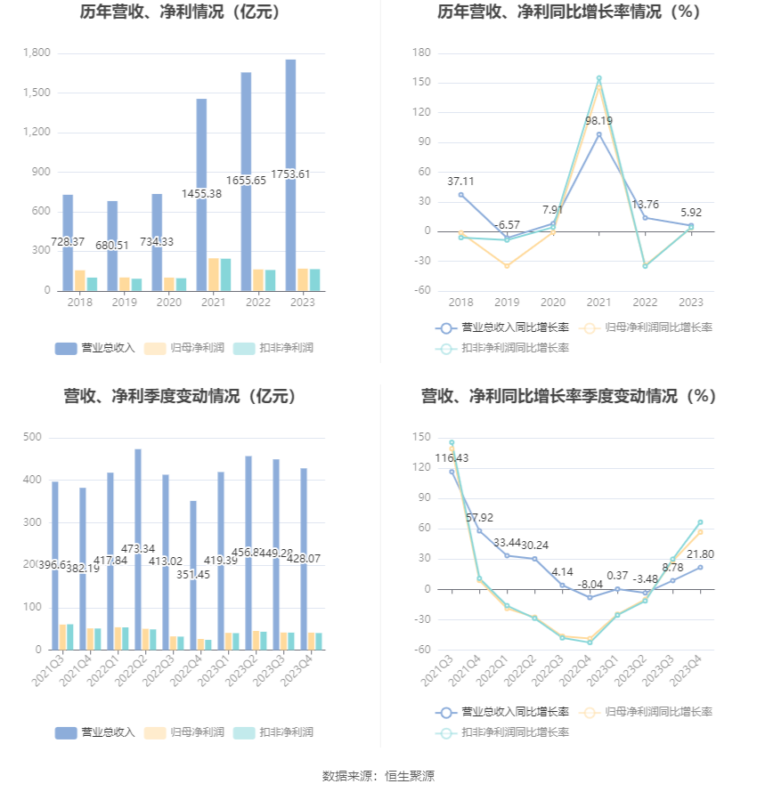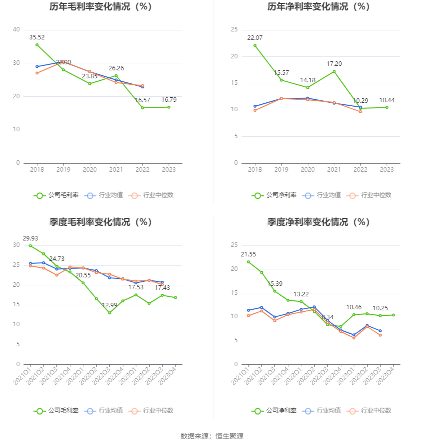 2023年,公司毛利率为16.79%,同比上升0.22个百分点;净利率为10.44%,较上年同期上升0.15个百分点。从单季度指标来看,2023年第四季度公司毛利率为16.86%,同比上升0.85个百分点,环比下降0.57个百分点;净利率为10.38%,较上年同期上升2.39个百分点,较上一季度上升0.13个百分点。