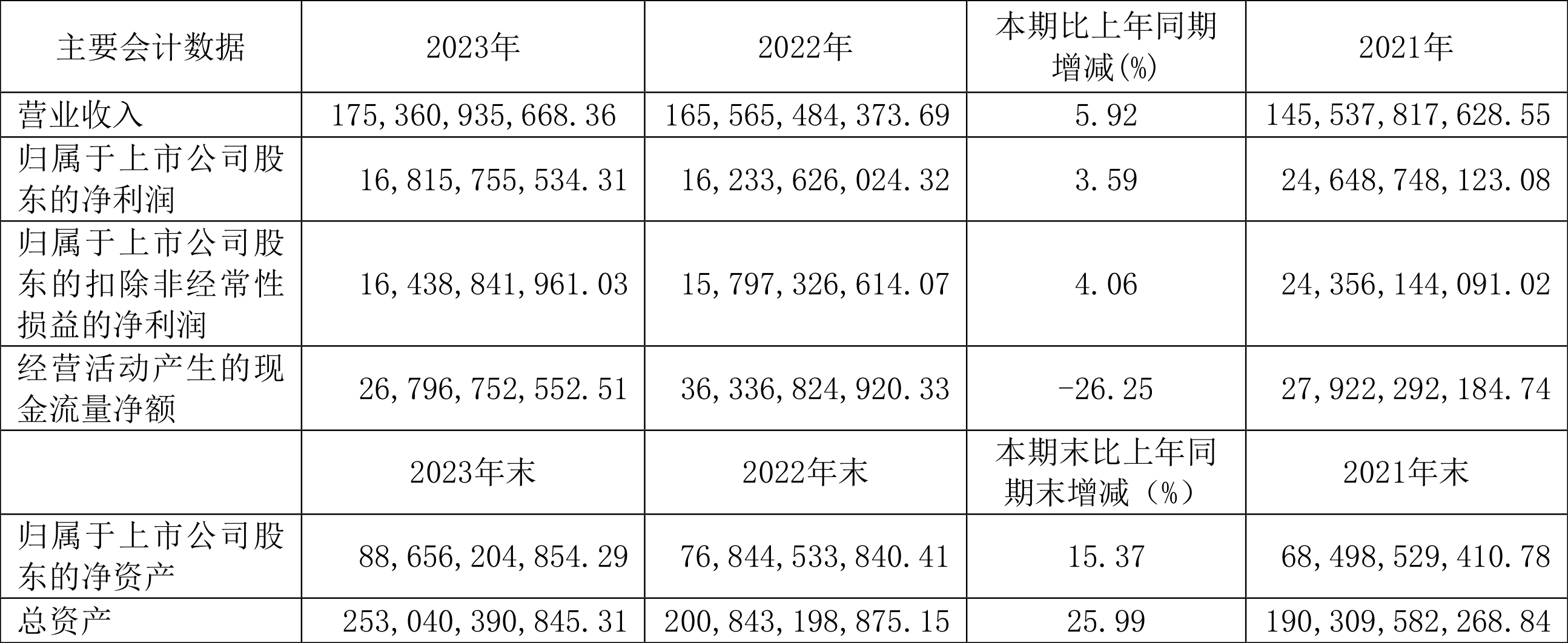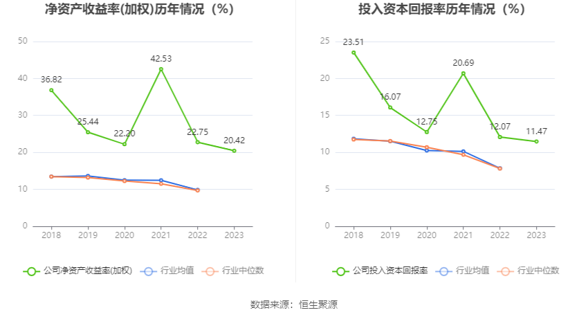 数据显示,2023年公司加权平均净资产收益率为20.42%,较上年同期下降2.33个百分点;公司2023年投入资本回报率为11.47%,较上年同期下降0.60个百分点。