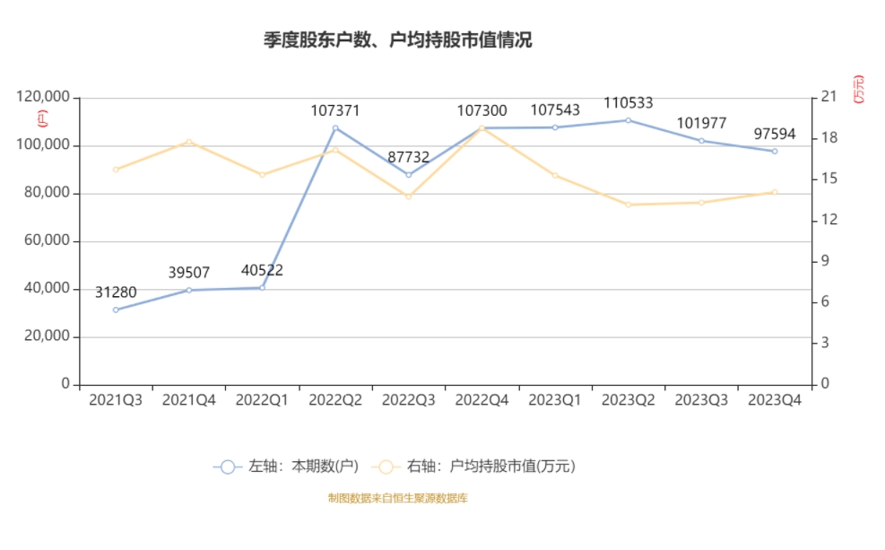 筹码集中度方面,截至2023年末,公司股东总户数为9.76万户,较三季度末下降了4383户,降幅4.3%;户均持股市值由三季度末的13.32万元上升至14.09万元,增幅为5.79%。