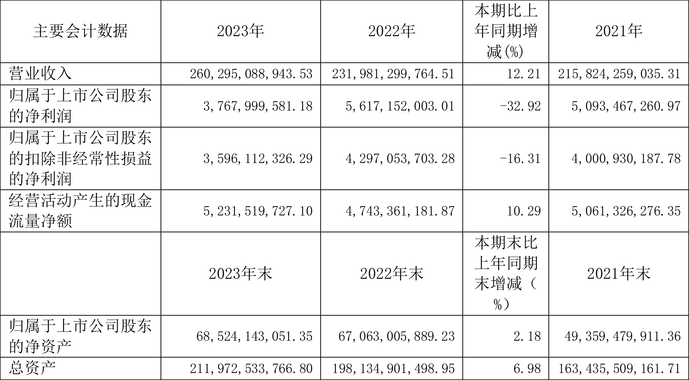 2023年,公司经营活动现金流净额为52.32亿元,同比增长10.29%;筹资活动现金流净额2.32亿元,同比减少119.07亿元;投资活动现金流净额-24.92亿元,上年同期为-124.73亿元。