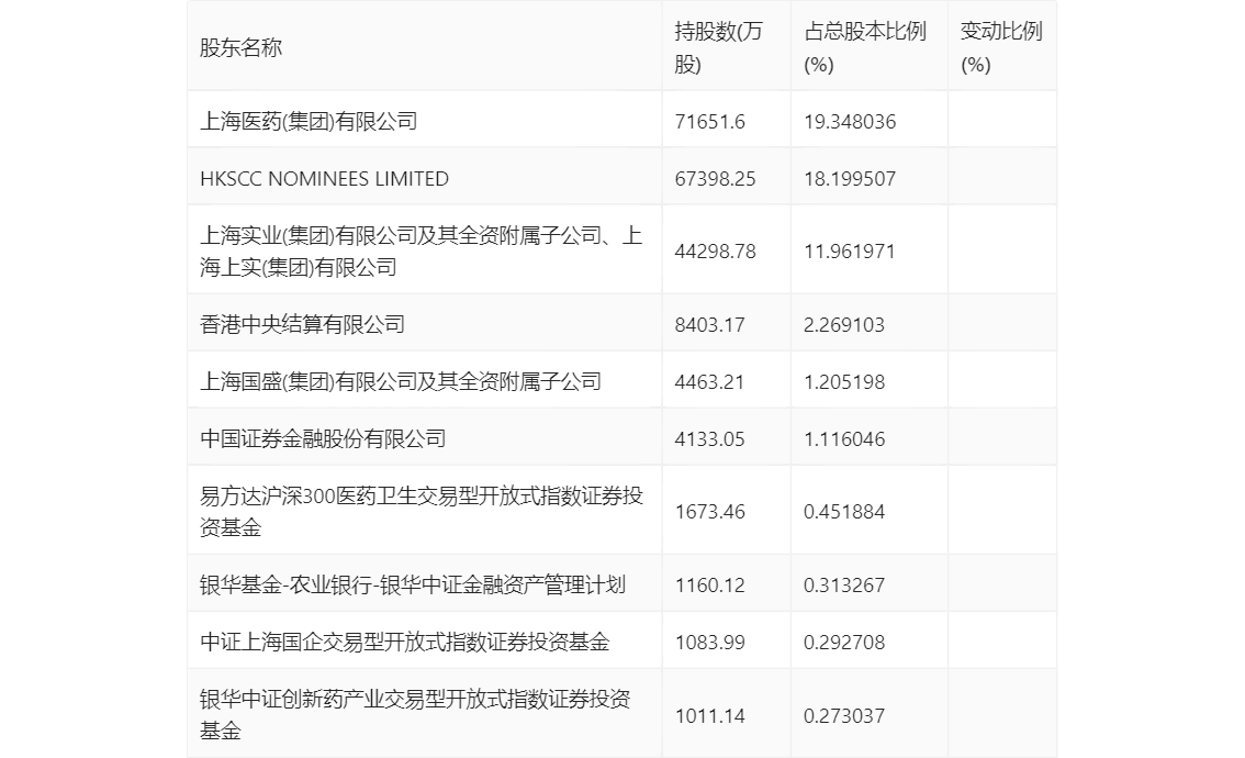 年报显示,2023年年末公司十大流通股东中,新进股东为上海实业(集团)有限公司及其全资附属子公司、上海上实(集团)有限公司、上海国盛(集团)有限公司及其全资附属子公司、银华中证创新药产业交易型开放式指数证券投资基金,取代了三季度末的上实集团及其全资附属子公司、上海上实及其全资附属子公司、上海国盛(集团)有限公司及其全资子公司上海盛睿投资有限公司、上海国盛集团资产有限公司、工银瑞信创新动力股票型证券投资基金。在具体持股比例上,HKSCC NOMINEES LIMITED持股有所上升,香港中央结算有限公司、易方达沪深300医药卫生交易型开放式指数证券投资基金、中证上海国企交易型开放式指数证券投资基金持股有所下降。