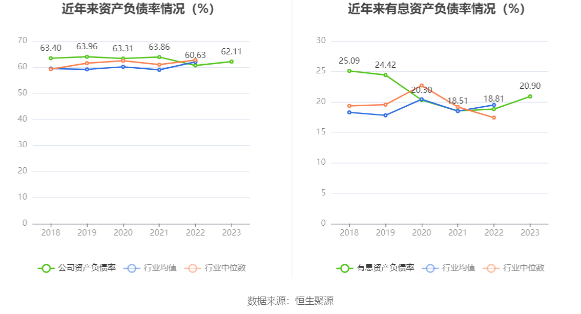 在偿债能力方面,公司2023年年末资产负债率为62.11%,相比上年末上升1.48个百分点;有息资产负债率为20.90%,相比上年末上升2.09个百分点。