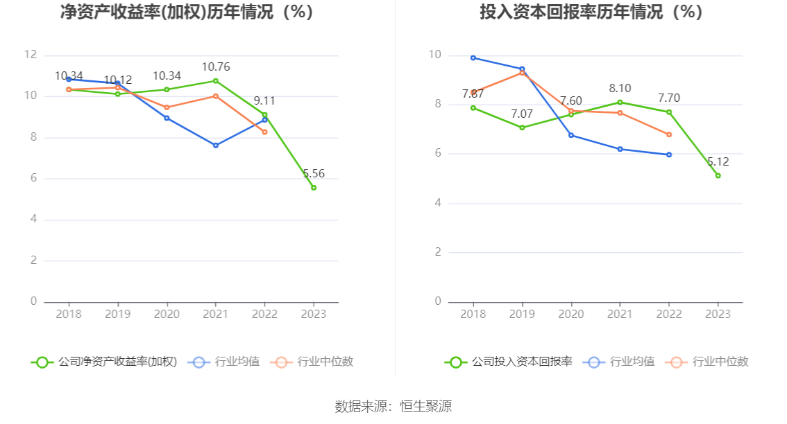 数据显示,2023年公司加权平均净资产收益率为5.56%,较上年同期下降3.55个百分点;公司2023年投入资本回报率为5.12%,较上年同期下降2.58个百分点。