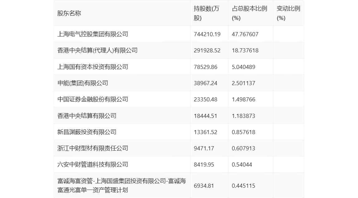 年报显示,2023年年末公司十大流通股东中,持股最多的为上海电气控股集团有限公司,占比47.77%。十大流通股东名单相比2023年三季报维持不变。在具体持股比例上,香港中央结算(代理人)有限公司、申能(集团)有限公司、香港中央结算有限公司持股有所上升。