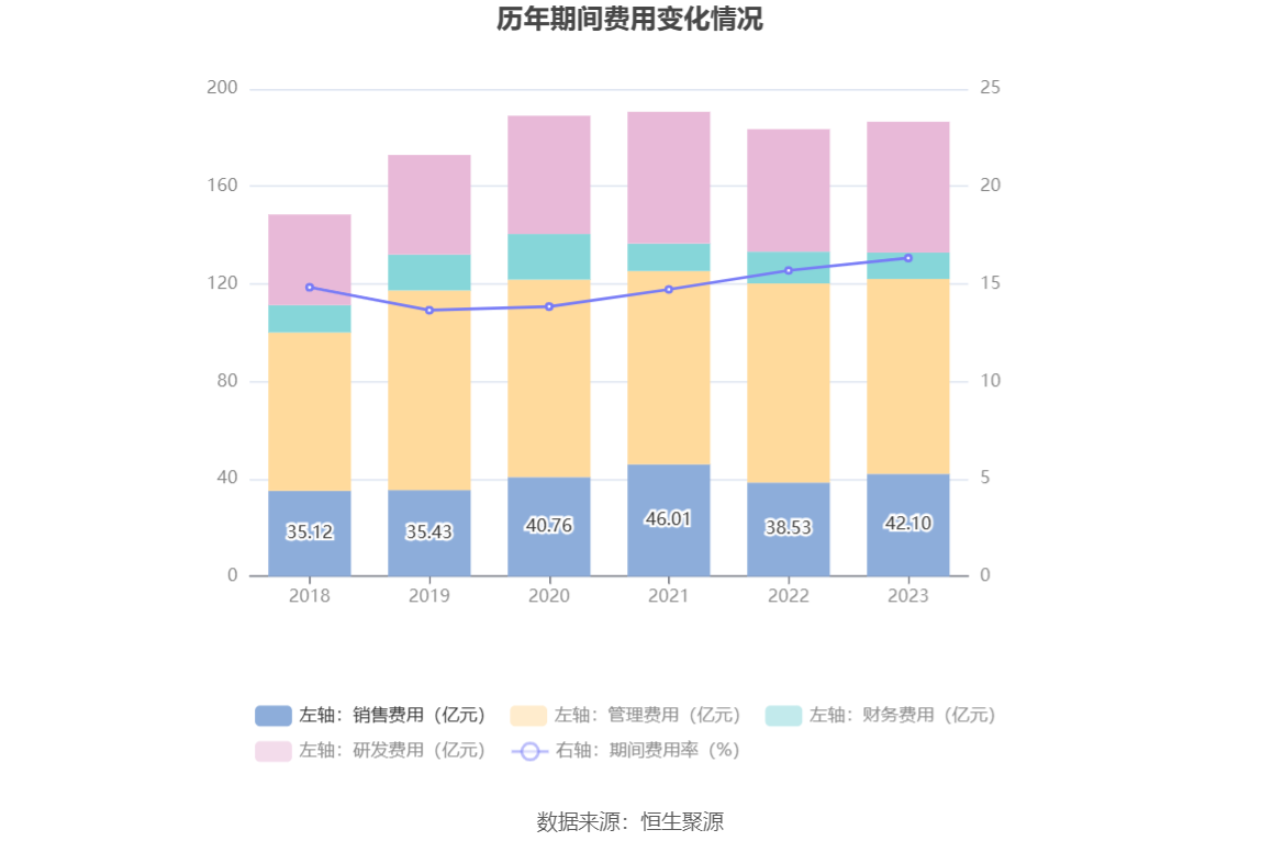 2023年,公司期间费用为186.56亿元,较上年同期增加3.05亿元;期间费用率为16.33%,较上年同期上升0.64个百分点。其中,销售费用同比增长9.25%,管理费用同比下降2.11%,研发费用同比增长6.78%,财务费用同比下降16.84%。