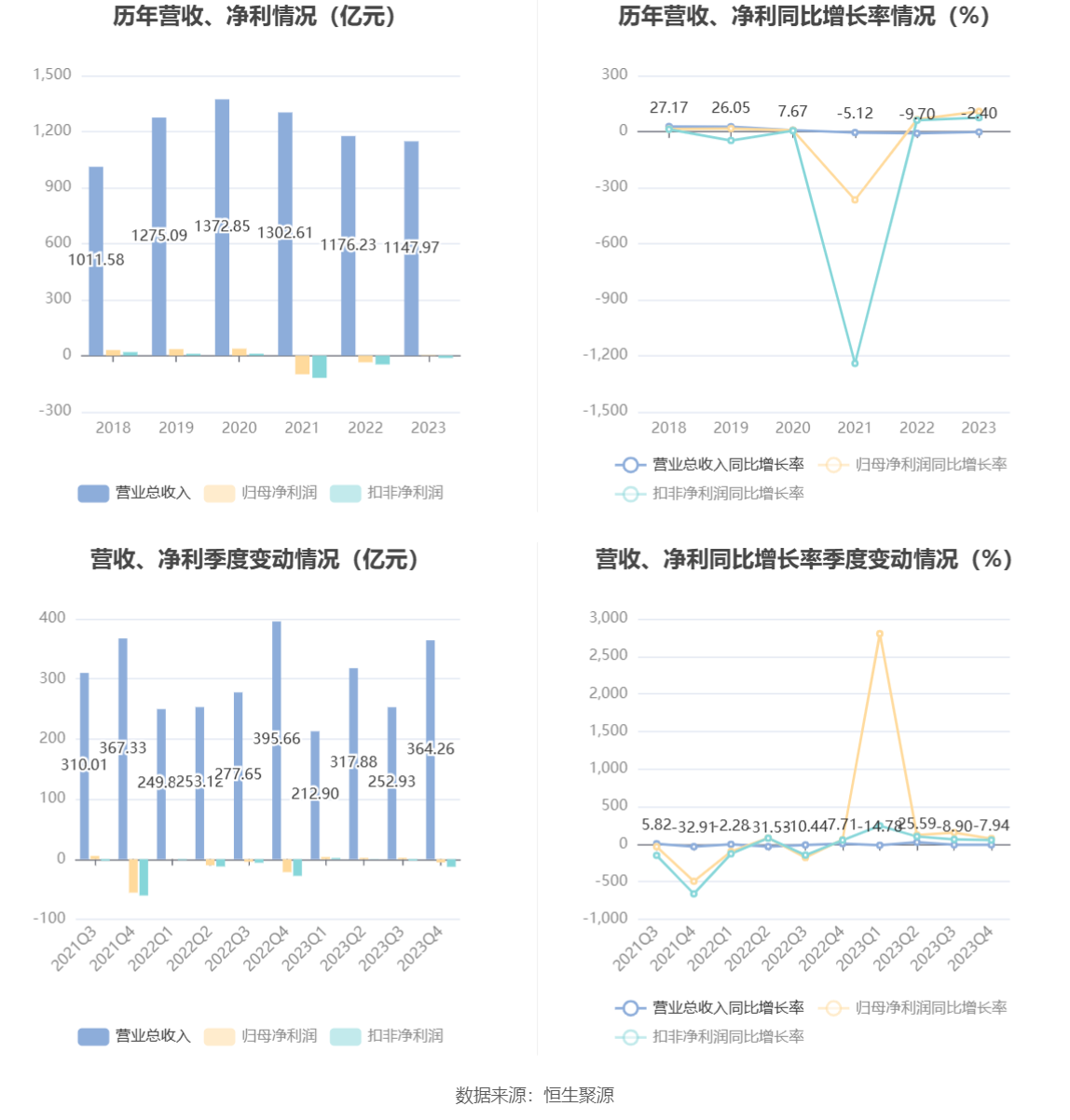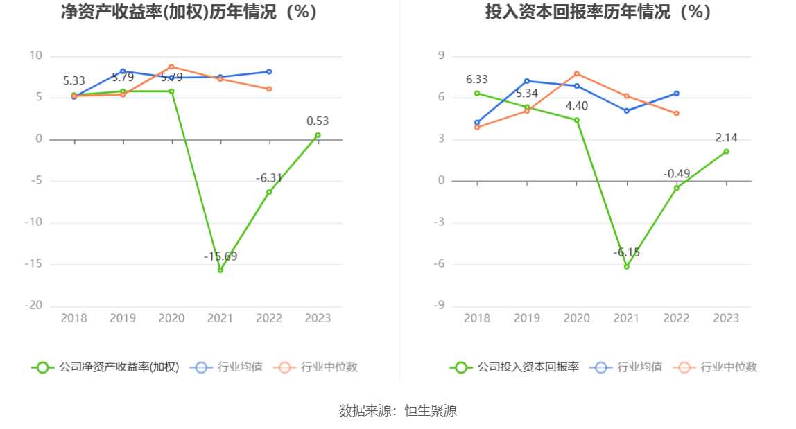 数据显示,2023年公司加权平均净资产收益率为0.53%,较上年同期增长6.84个百分点;公司2023年投入资本回报率为2.14%,较上年同期增长2.63个百分点。
